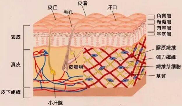 表皮层下面是真皮层,由弹性结缔组织、弹性纤维、血管等组成,弹性结缔组织的主要成分就是胶原蛋白,它能够紧致肌肤,胶原蛋白降解时就会产生皮肤松弛和皱纹。